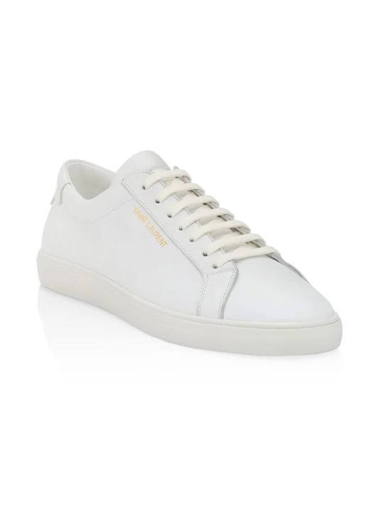 Saint Laurent introduced its famous Le Smoking tuxedo in 1966, a rendition of the classic men’s smoking suit made for women. Inspired by the iconic silhouette and 1970s women’s archival pieces, Creative Director Anthony Vaccarello reinterprets these styles for menswear with slinky, billowing shapes, delicate textures, and intricate patterns. The result is a unique, androgynous look that celebrates fluidity as a cornerstone of contemporary fashion. These sleek leather sneakers feature elegant, understated logos on the side and heel.