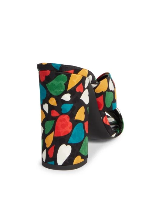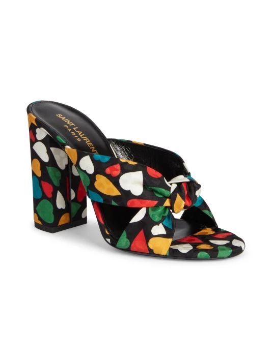 Printed with vibrant multicolor hearts, these twist-front silk jacquard sandals feature a wearable block heel.