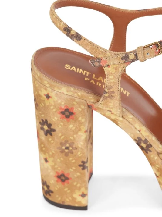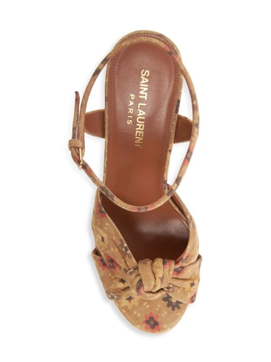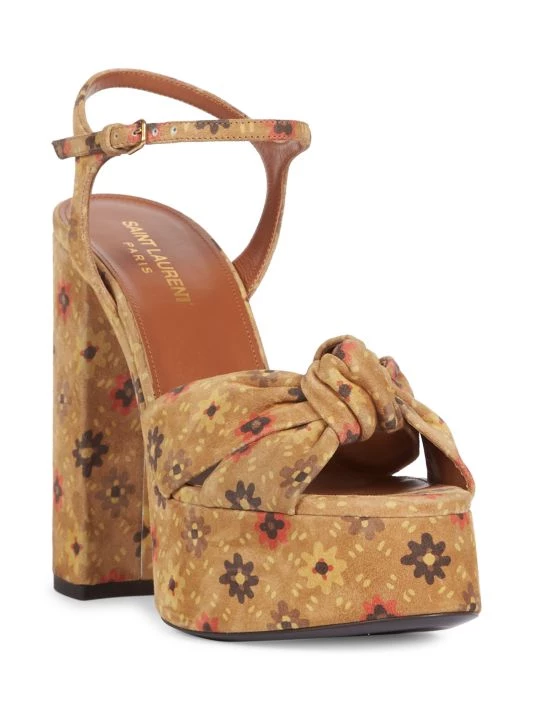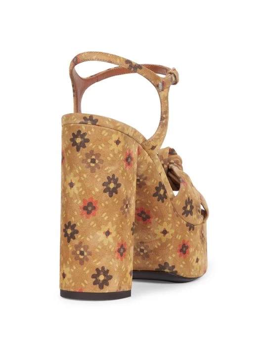 70s-inspired leather platforms with a chic knotted top strap and a faded floral print.