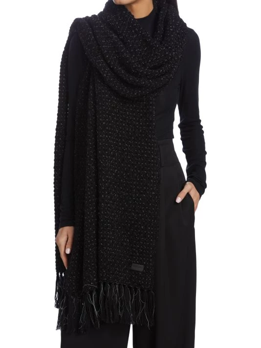 Rectangular scarf flaunts allover multicolor lamé stripes, finished with a wispy tassel trim.