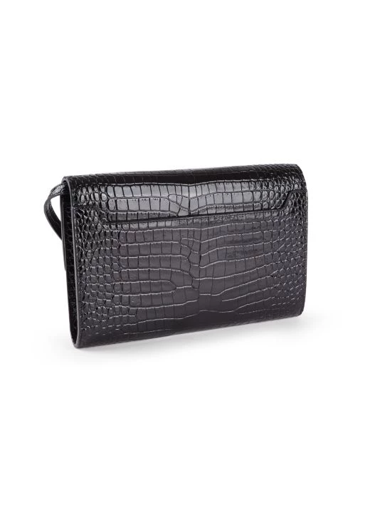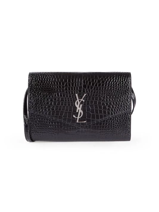 Glossy patent leather in a croc-embossed finish and signature silvertone monogram clasp defines this wallet with strap.