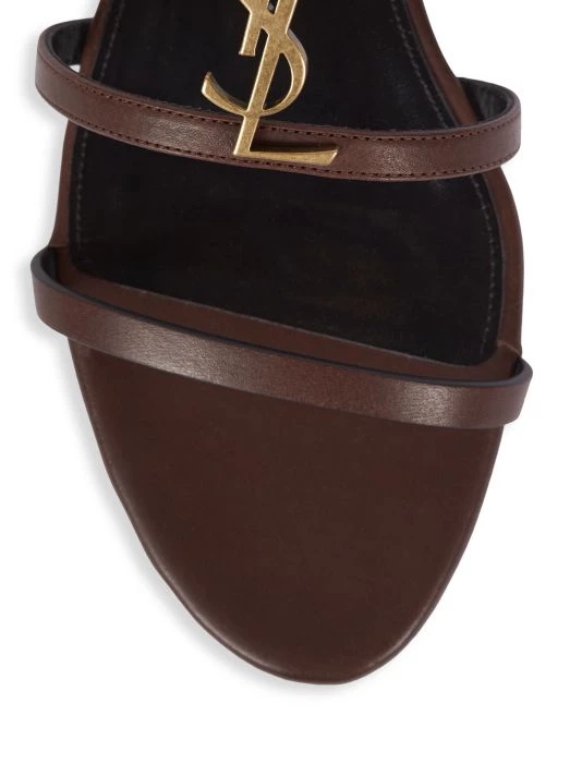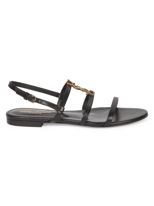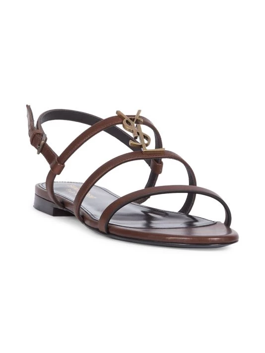 Strappy flat sandals flaunt petite goldtone monogram hardware in a smooth leather finish.