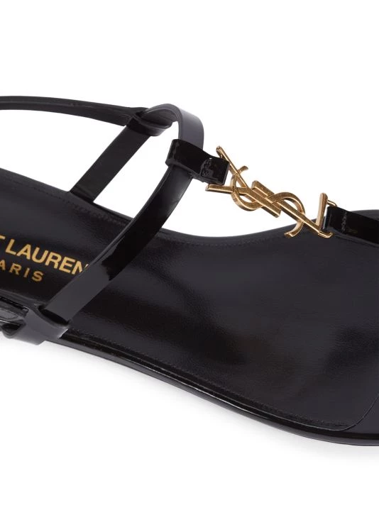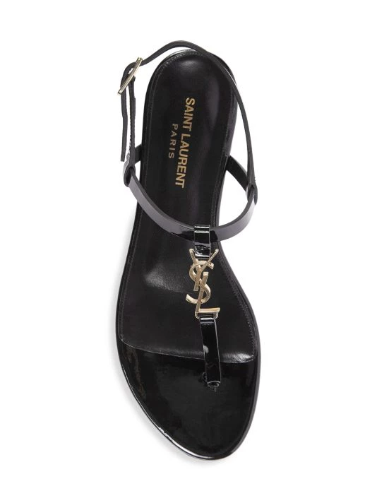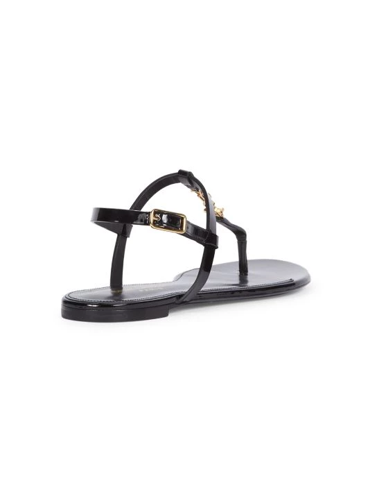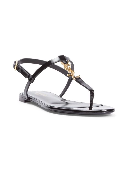 Strappy flat thongs flaunt petite goldtone monogram hardware in a patent leather finish.
