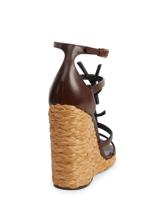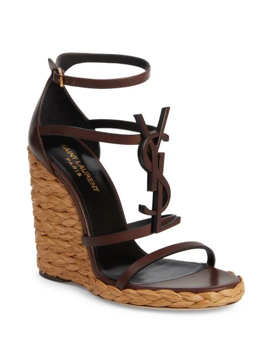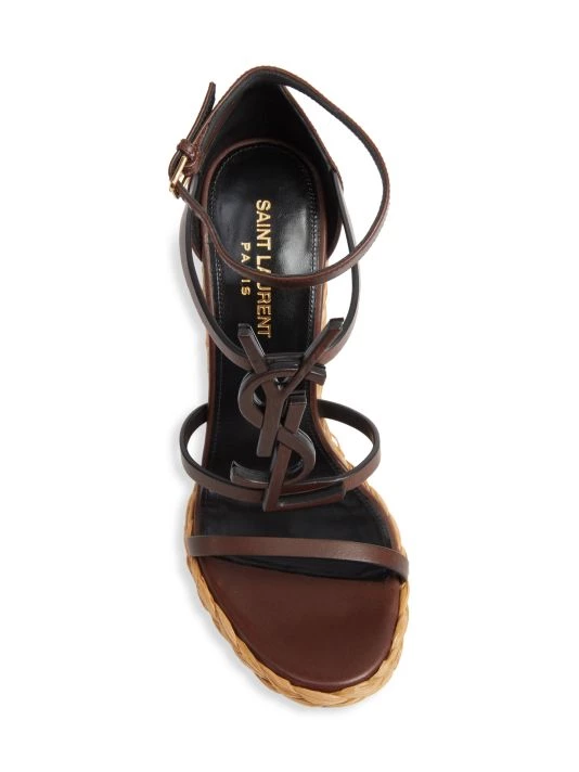 A woven raffia-covered wedge heel anchors these statement strappy sandals with a bold logo plaque across the instep.