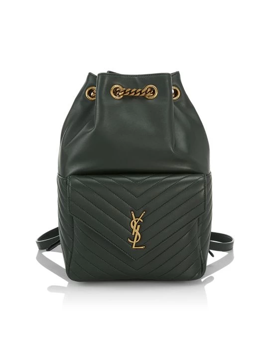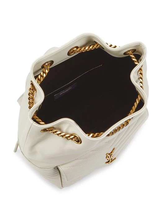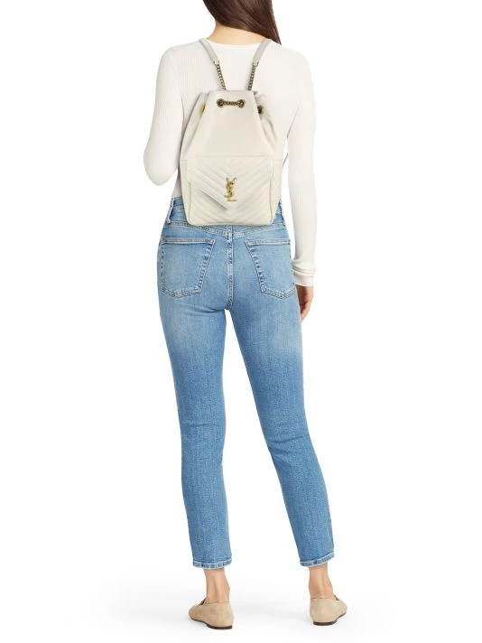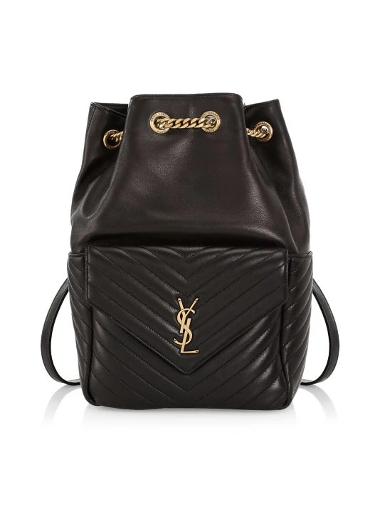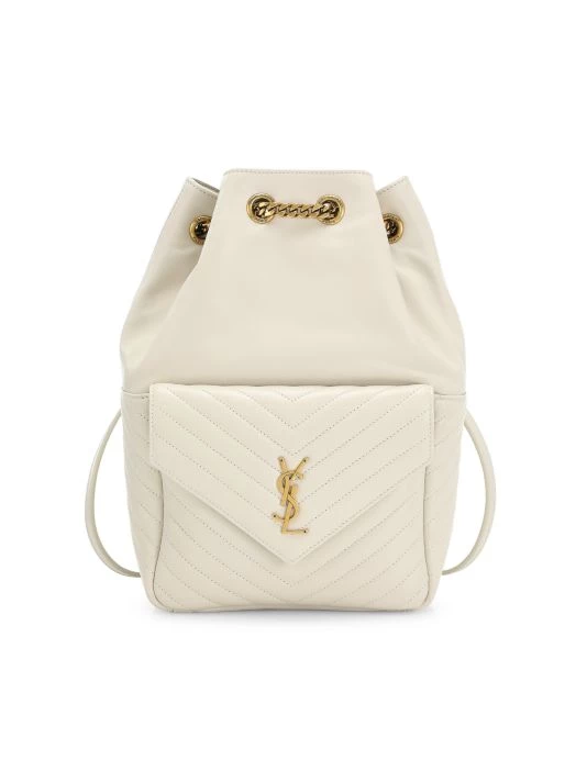 This bucket backpack is highlighted with YSL hardware at chevron quilted envelope flap.