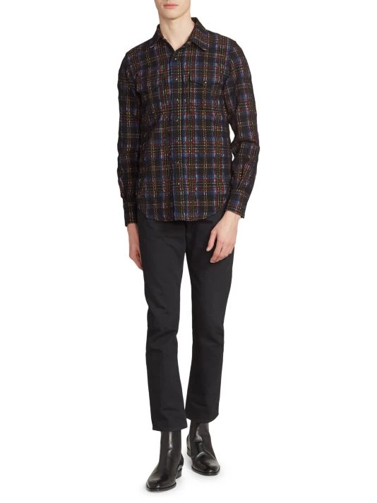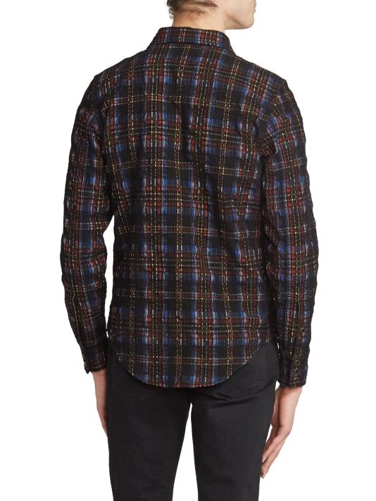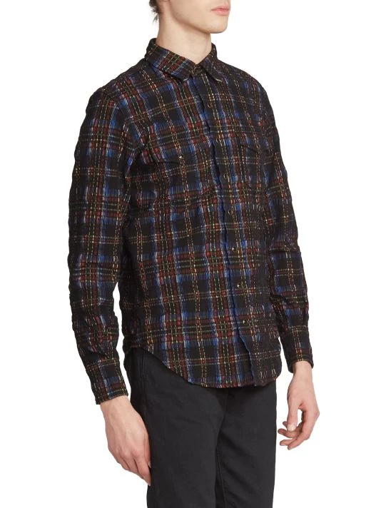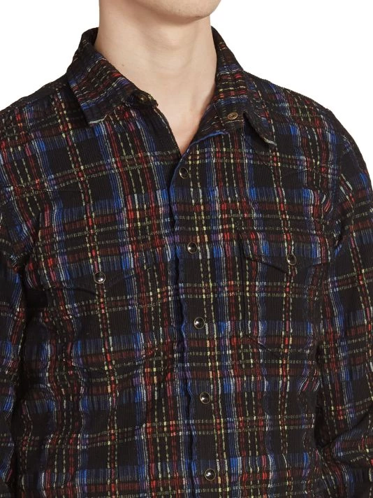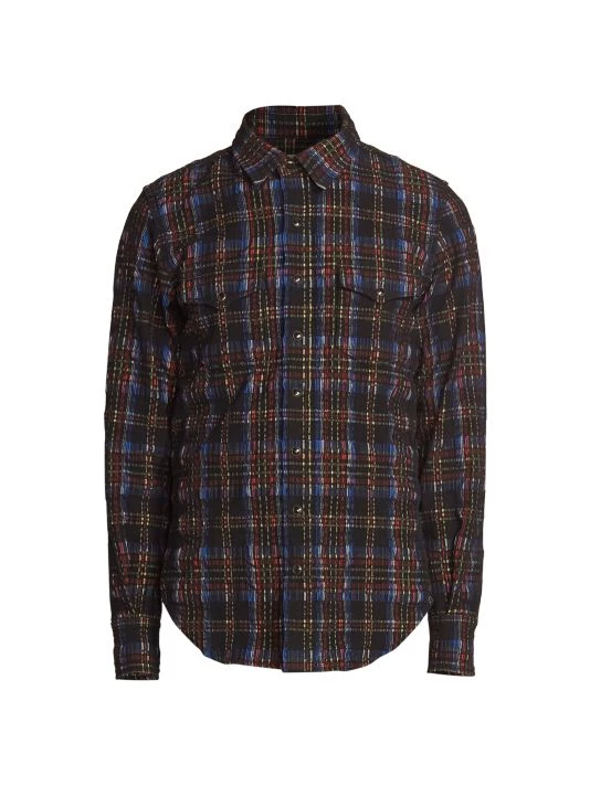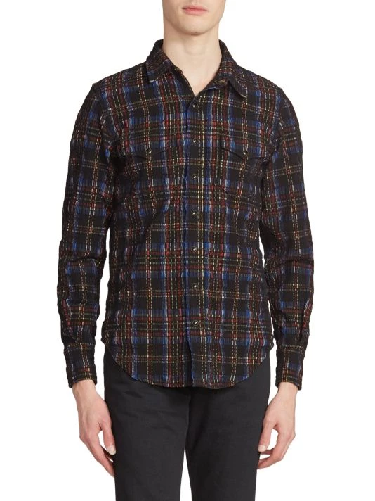 Western-style detailing defines this plaid snap-front stretch cotton shirt.