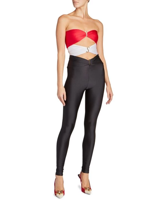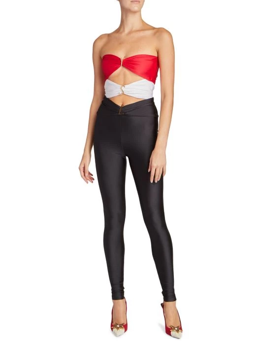 With a bold colorblocked design, this jumpsuit gathers at a stacked bodice adorned with goldtone monogram hardware.