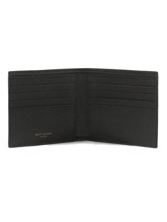 Crafted of pebbled leather, this bi-fold card holder is adorned with a YSL logo on the front.