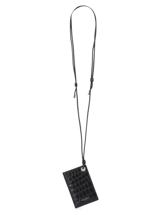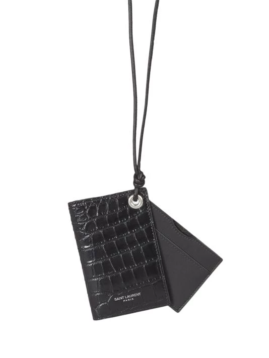 Saint Laurent introduced its famous Le Smoking tuxedo in 1966, a rendition of the classic men’s smoking suit made for women. Inspired by the iconic silhouette and 1970s women’s archival pieces, Creative Director Anthony Vaccarello reinterprets these styles for menswear with slinky, billowing shapes, delicate textures, and intricate patterns. The result is a unique, androgynous look that celebrates fluidity as a cornerstone of contemporary fashion. This cardholder is crafted from croc-embossed leather and features an adjustable neck strap.