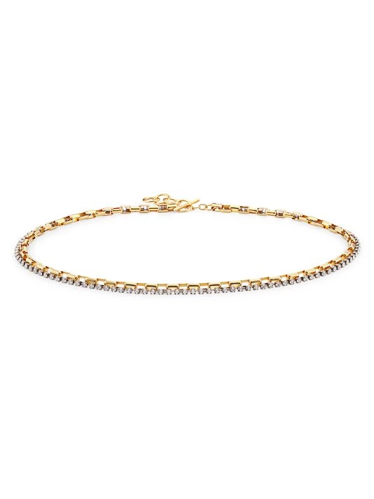 This goldtone metal belt features rectangular cable-chain links embellished with rhinestones.