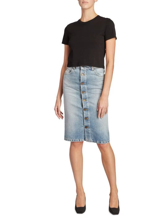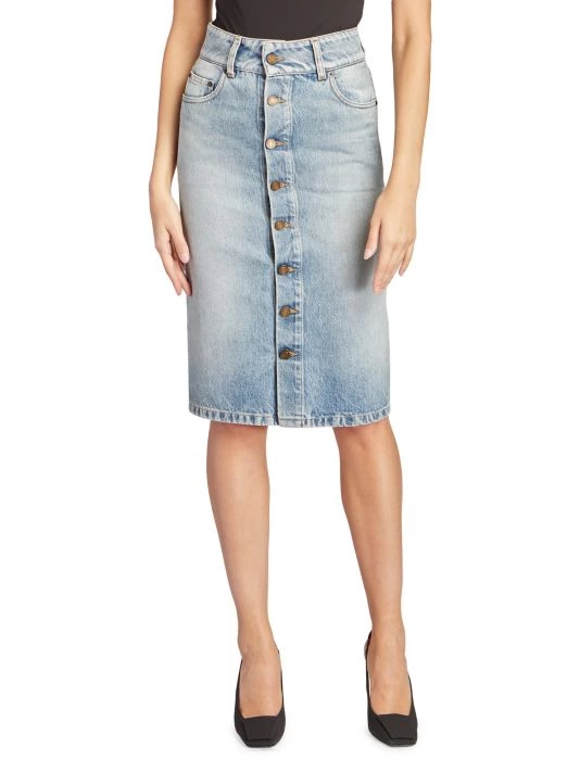 Saint Laurent’s pencil-silhouette skirt is updated with denim fabrication. With a five-pocket cut and button front, this design has a faded wash for a casual style.