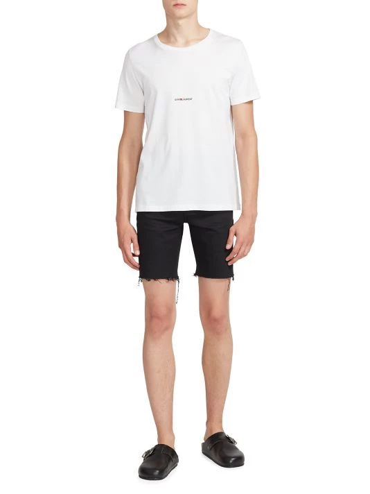 A pair of classic black denim shorts featuring a raw hem for a relaxed look.