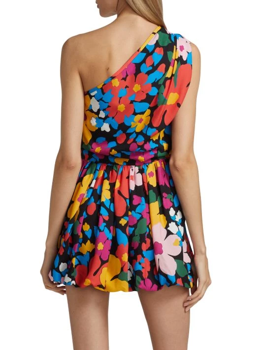 Cut in a one-shoulder silhouette, this pleated minidress boasts mixed floral prints and a dimensional bubble hem.