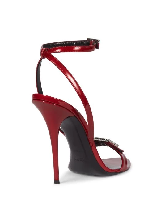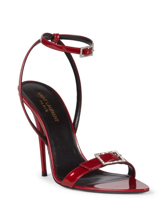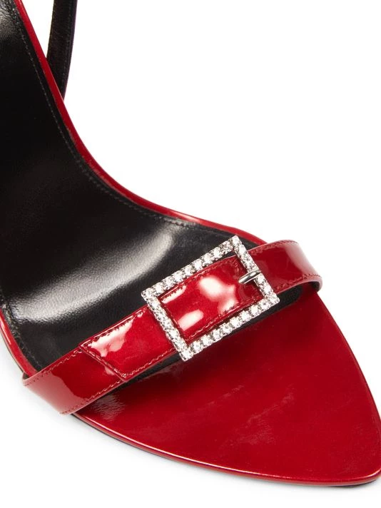 Made in Italy of rich patent leather, Saint Laurent’s Gippy sandals feature metal buckles adorned with gleaming crystals. This pair is anchored by a leg-lengthening stiletto heel.
