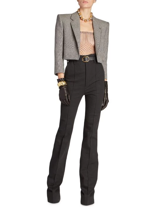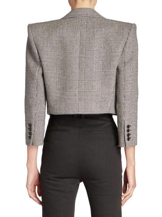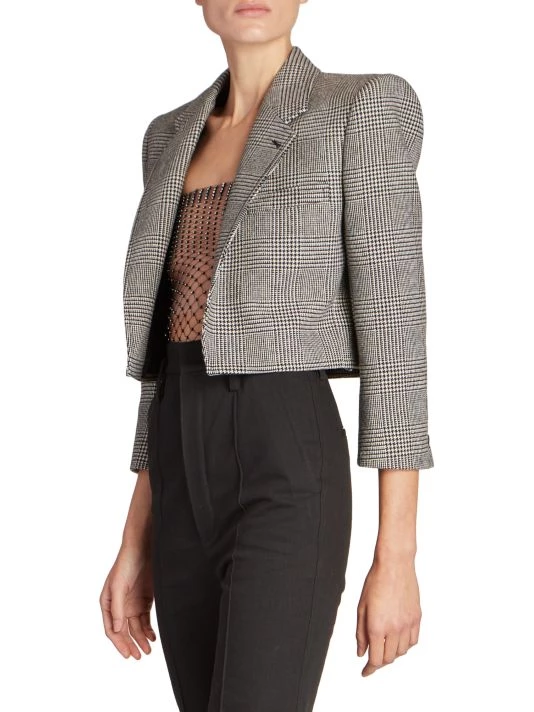 Crafted of luxurious Italian wool, this open cropped blazer has a classic glen check pattern updated with an edgy cropped length.