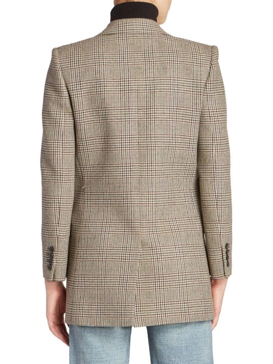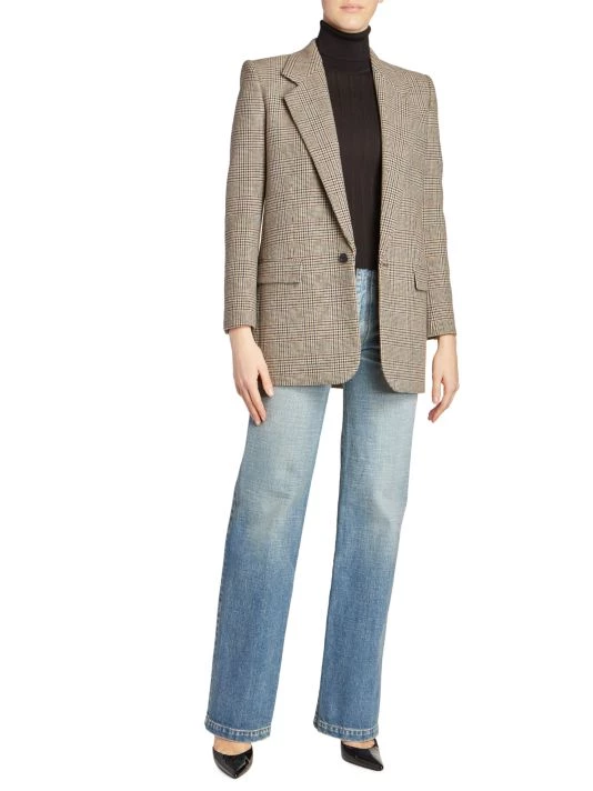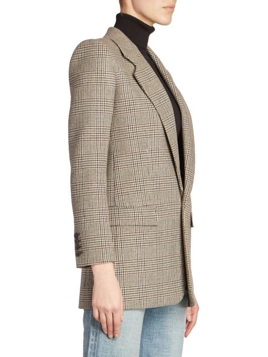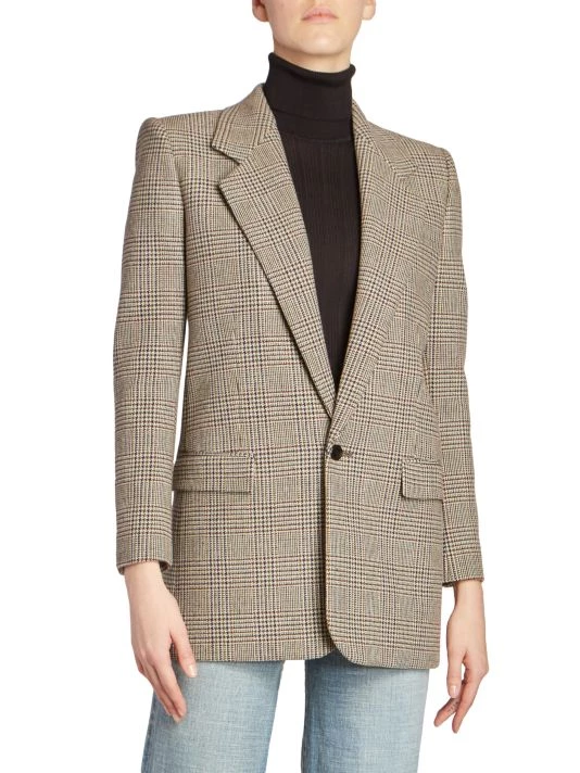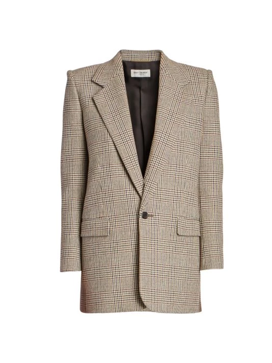 From Saint Laurent, this posh glen check blazer has a subtly oversized fit crafted of a soft wool blend.