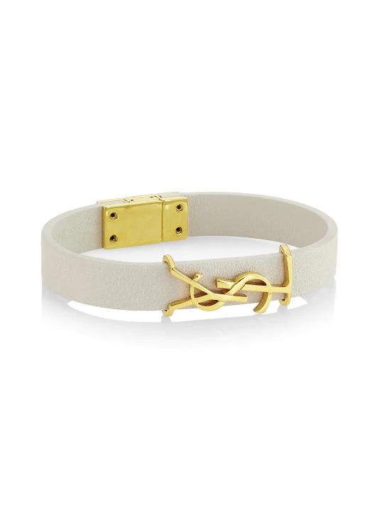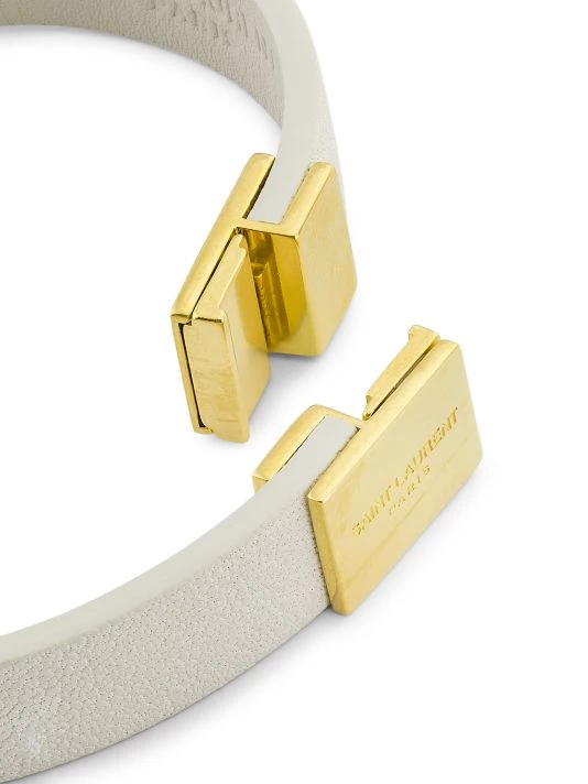 Saint Laurent’s leather bracelet is adorned with a goldtone logo motif.
