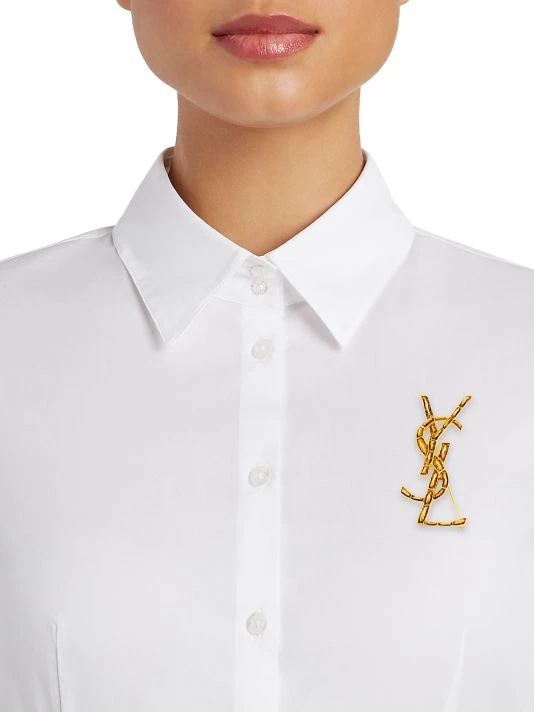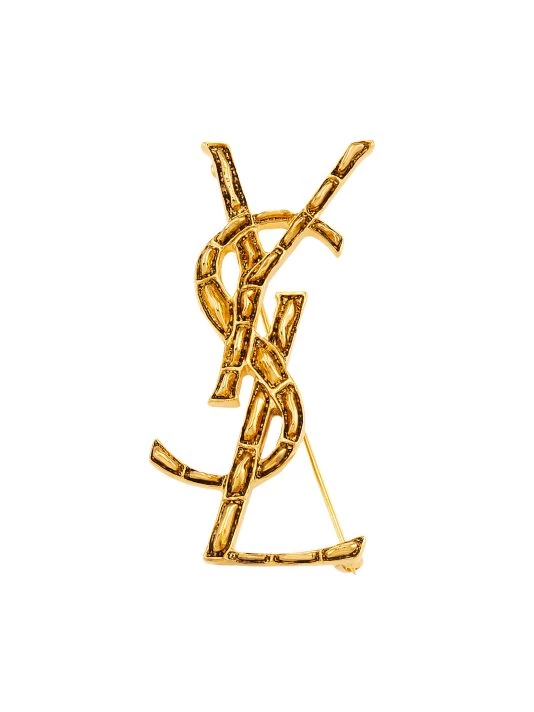 Engraved with textured crocodile scales, this goldtone brooch boasts signature interlocking YSL monogram.