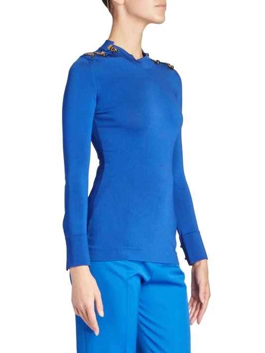 Saint Laurent’s fitted sweater is fashioned with a sophisticated mock turtleneck. Adorned with goldtone hardware at the shoulders, this top has a classic silhouette with an updated edge.
