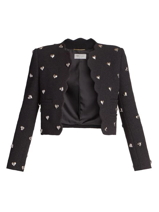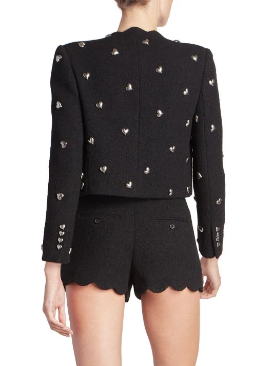 Slightly cropped, this wool-blend open jacket is adorned with silvertone heart appliqués and scalloped trim.