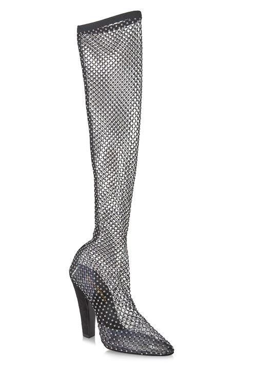Boasting a fishnet mesh construction, Saint Laurent’s Koller boots are decorated with shimmering rhinestones. This Italian-made pair is anchored by an angled block heel.