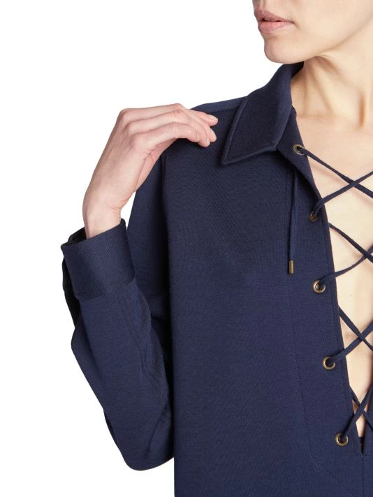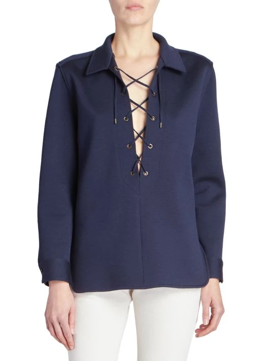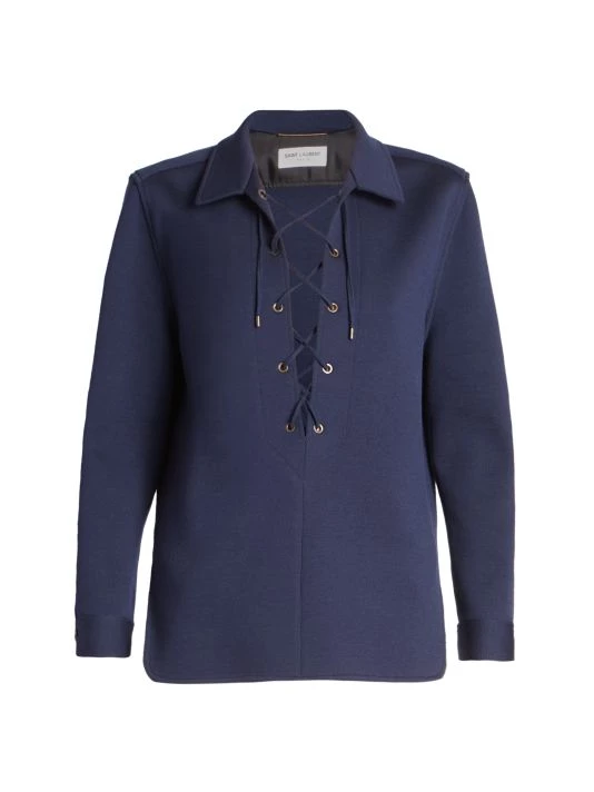 A plunging lace-up V-neck finishes this wool-blend collared shirt.