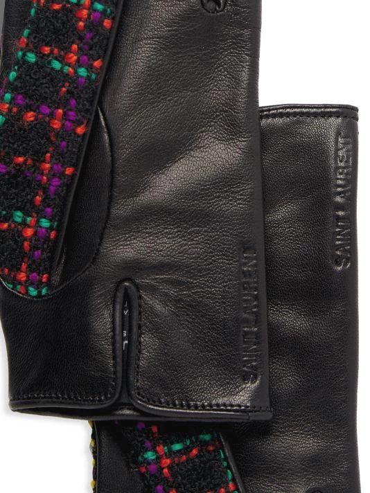 Crafted of checked tweed and leather, these bracelet-length gloves feature a vent at cuff and embossed logo at trim.