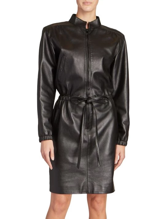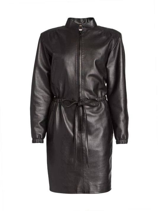 Saint Laurent’s Italian-leather sheath dress is tailored with a stand collar and welt pockets. Styled with a cinched drawstring waist, this design has a casual-cool meets edgy aesthetic.