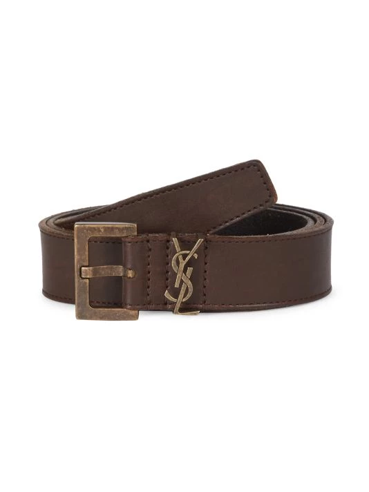 Saint Laurent introduced its famous Le Smoking tuxedo in 1966, a rendition of the classic men’s smoking suit made for women. Inspired by the iconic silhouette and 1970s women’s archival pieces, Creative Director Anthony Vaccarello reinterprets these styles for menswear with slinky, billowing shapes, delicate textures, and intricate patterns. The result is a unique, androgynous look that celebrates fluidity as a cornerstone of contemporary fashion. This smooth leather belt flaunts distressed goldtone hardware. A metal monogram logo plaque adorns the strap.