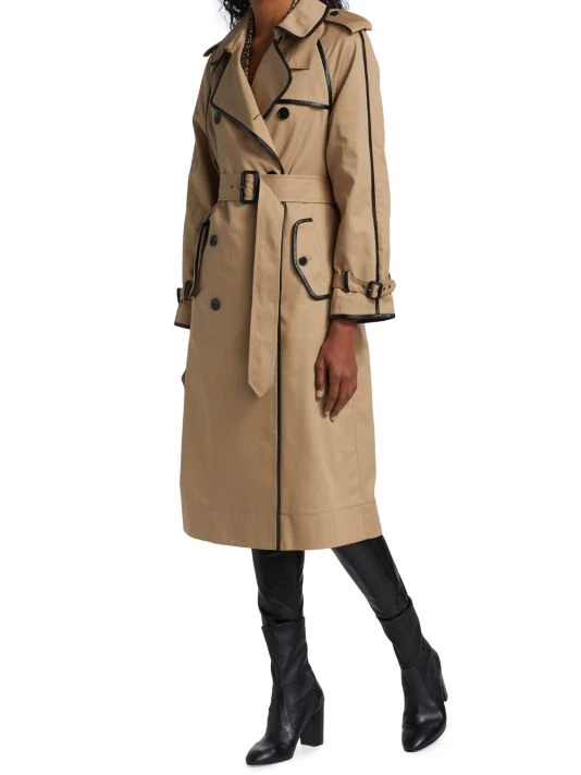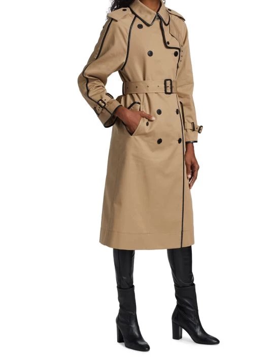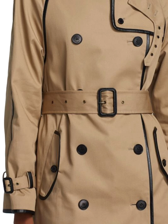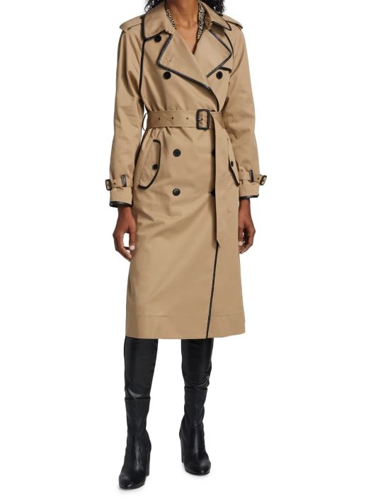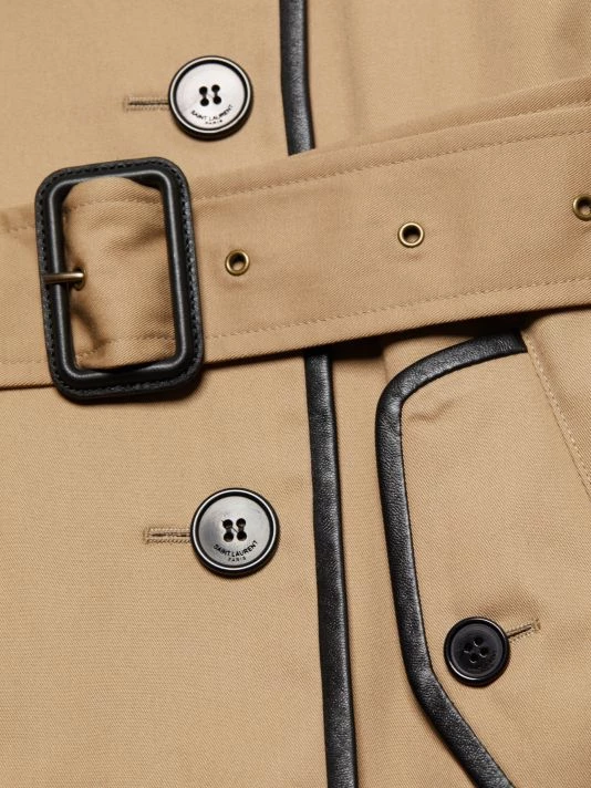 Classic trench coat elevated with contrast leather trim and optional tonal buckle belt.