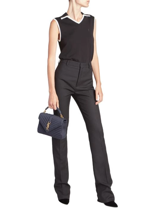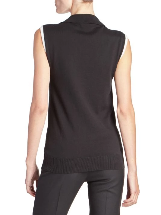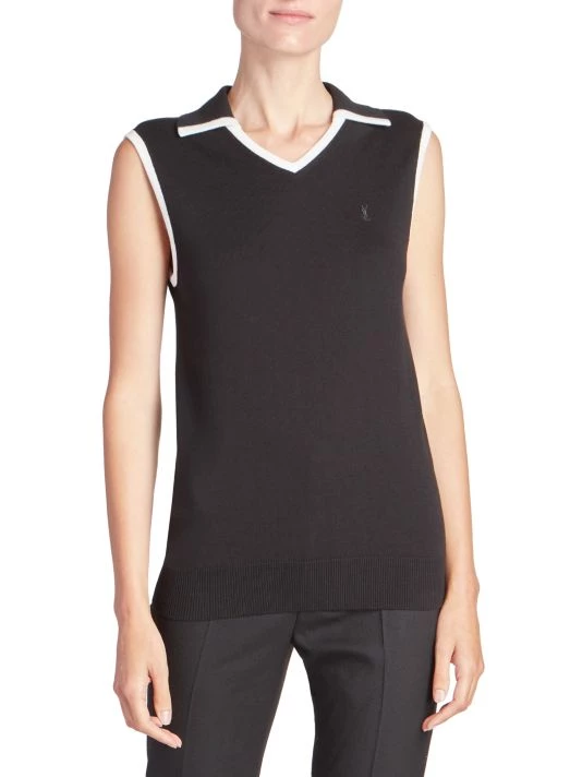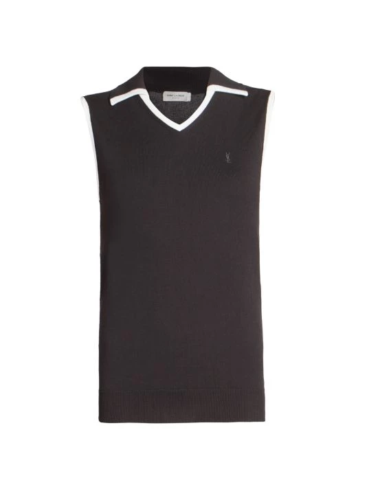 Contrast trim and an embroidered monogram finish this polished collared vest.
