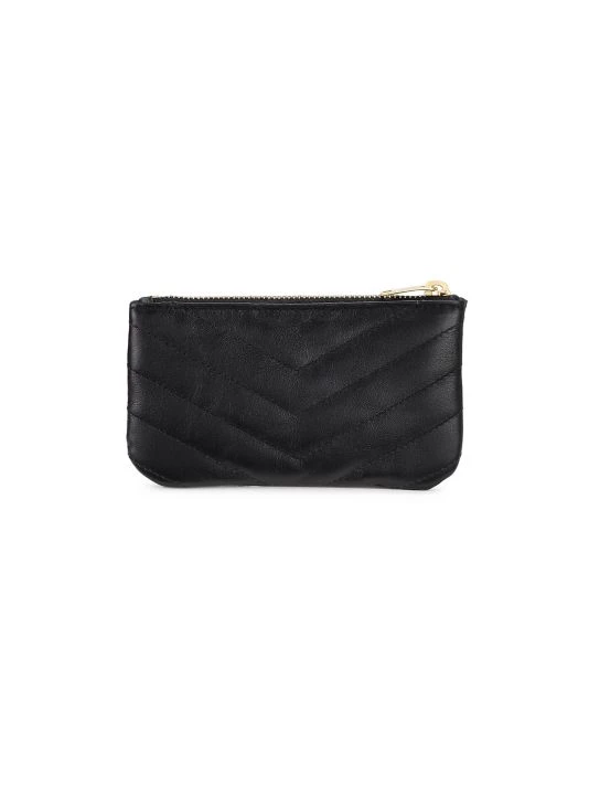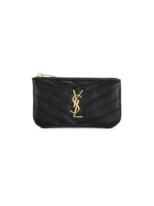Made in Italy of matelassé quilted leather, Saint Laurent’s coin purse is highlighted with polished YSL logo hardware. This compact piece is accompanied by an attached keychain.