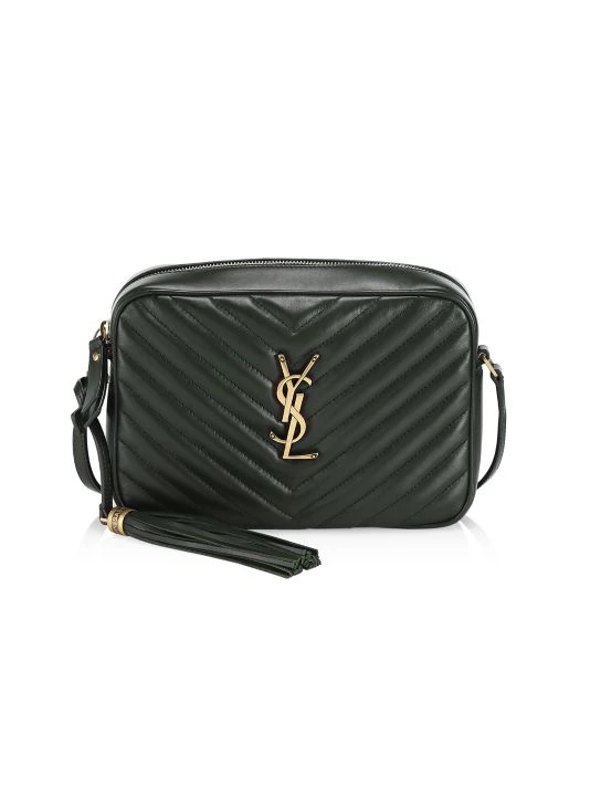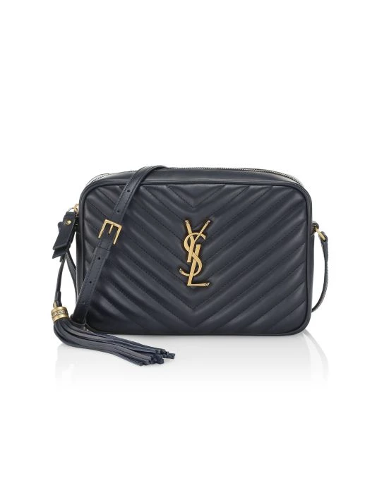 Chevron-stitched leather camera bag with tassel detail and iconic logo plaque.