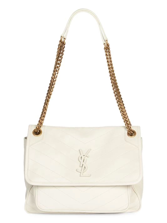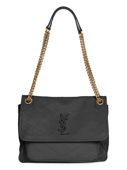 Leather bag defined by chevron seams and a goldtone curb chain strap.