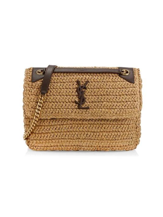 Made in Italy, Saint Laurent’s Niki bag is crafted of woven raffia and rich leather. This luxurious piece is highlighted with YSL logo hardware and a sliding chain strap.