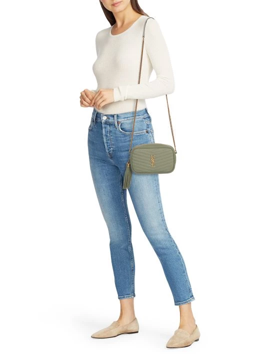 Signature chevron-quilted camera bag crafted of Italian calfskin leather, with goldtone logo hardware and a leather and chain strap.