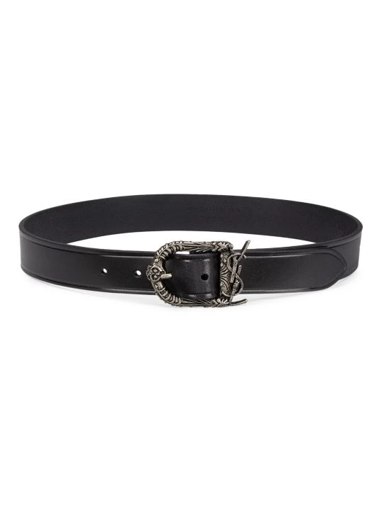 Lux leather belt boasts an intricately designed buckle incorporating Celtic motifs interlaced with the YSL initials.