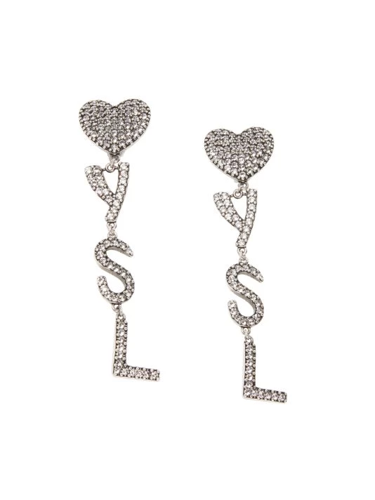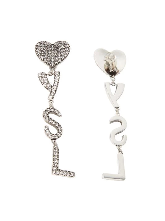Heart-shaped silvertone clip-on earrings anchor crystal-encrusted dangling monogram charms.