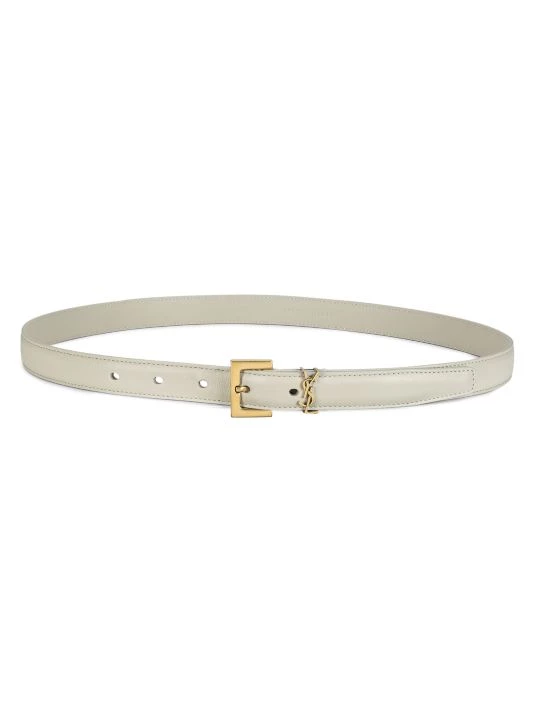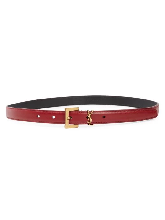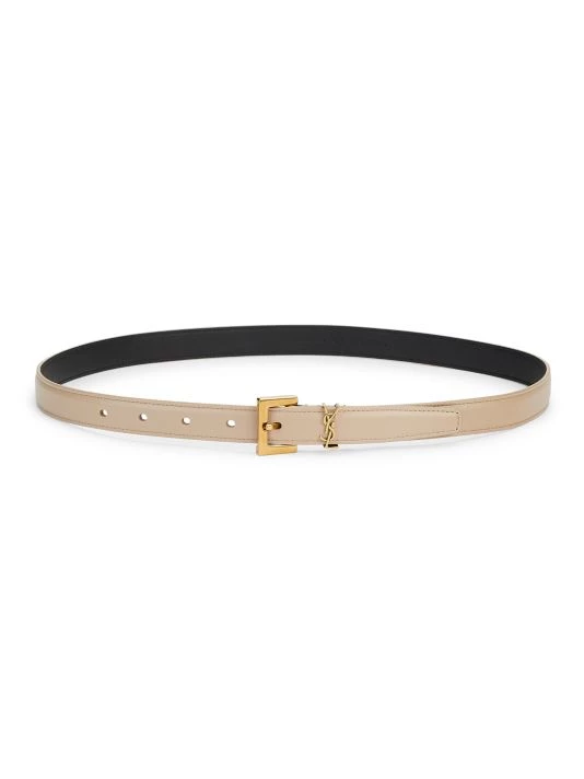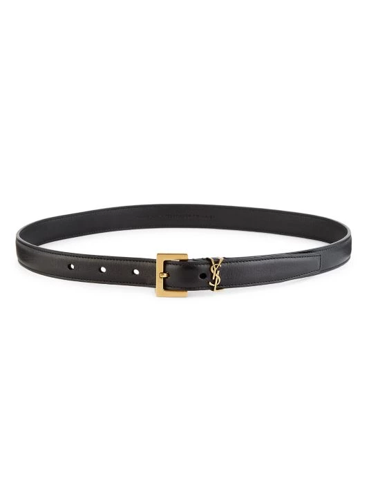 Sleek leather belt with the iconic logo insignia is a statement piece.