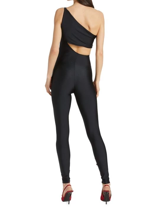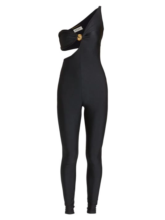 This fitted one-shoulder jumpsuit is adorned with a goldtone bead at the bust, showcasing an open side for an edgy aesthetic.