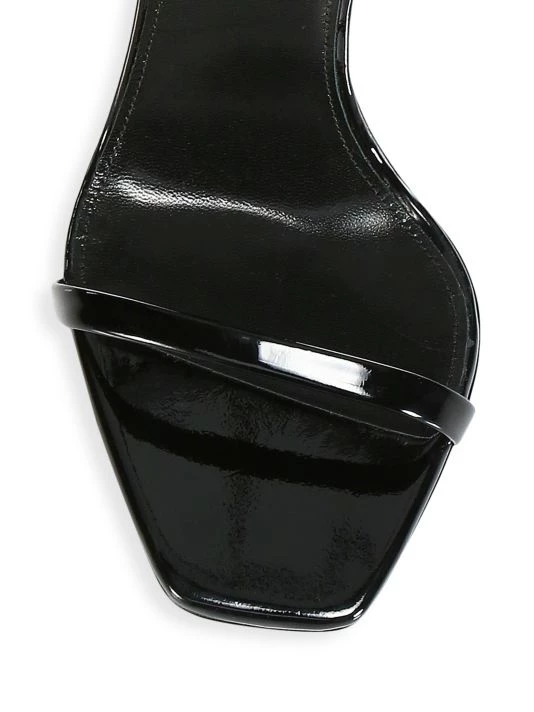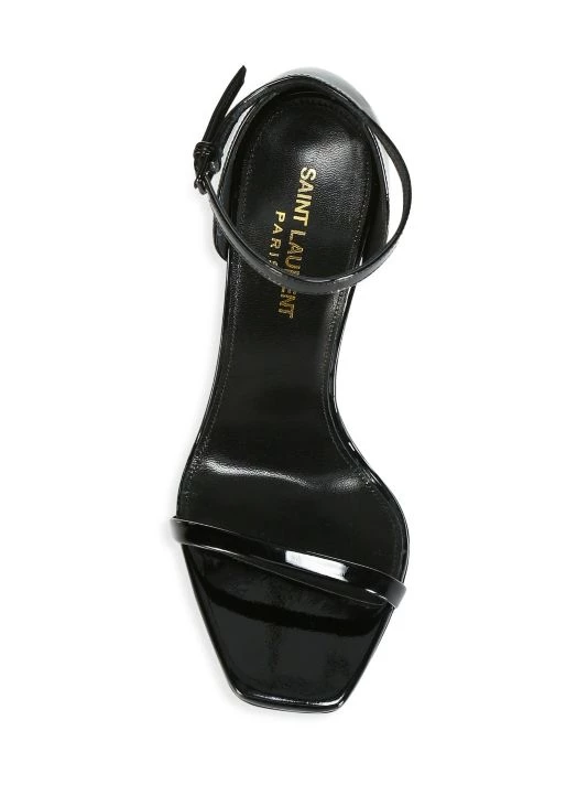 Sleek patent leather ankle-strap sandals with a goldtone sculpted logo heel.