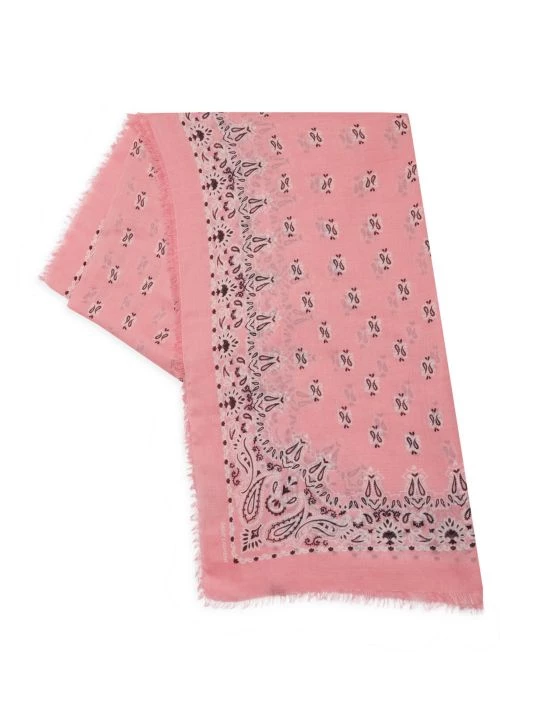 Italian-made bandana scarf showcasing a classic paisley print finished with wispy edges.
