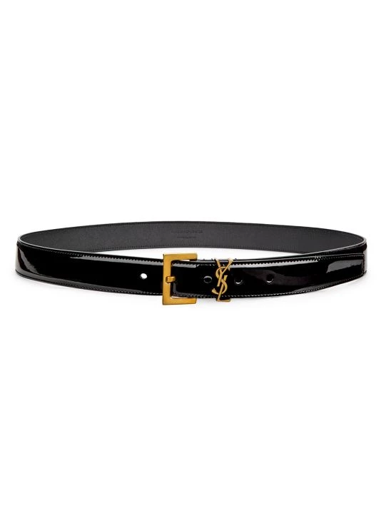 This shiny patent leather belt features a goldtone YSL logo buckle.