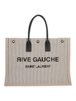Saint Laurent’s Rive Gauche tote is skillfully crafted in Italy of sturdy striped canvas with a spacious interior. Adorned with leather tubular straps, this easily recognizable piece is defined with bold logo text at the front.