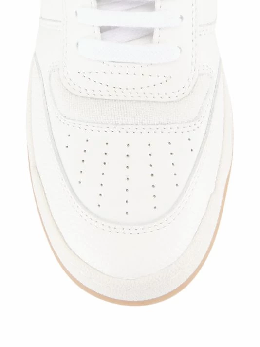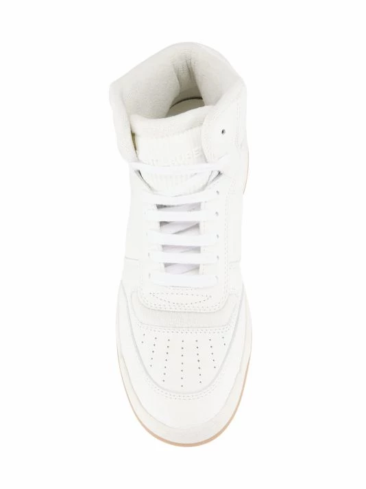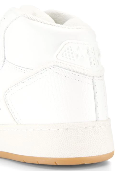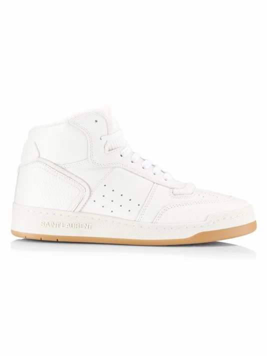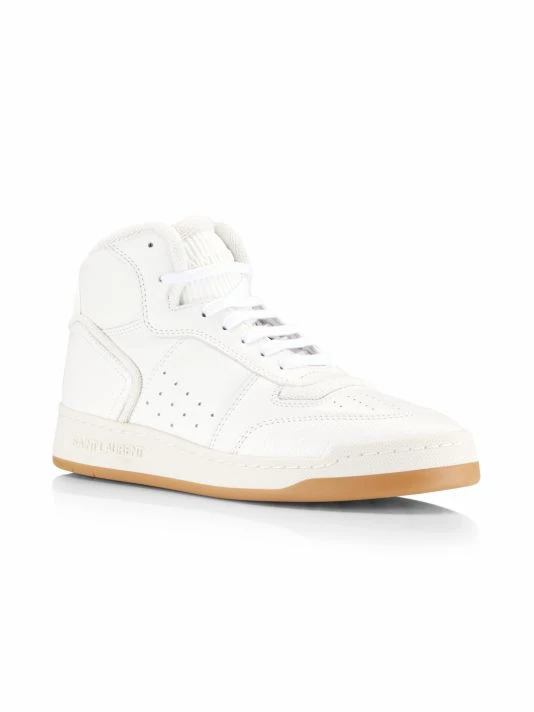 Saint Laurent’s SL/80 sneakers are crafted of smooth leather with tonal branded accents. This high-top silhouette is finished with a gum sole.