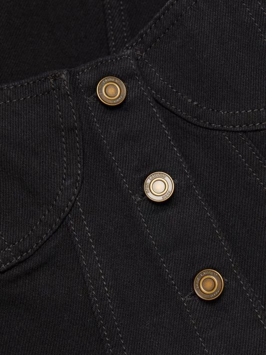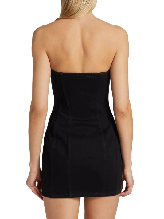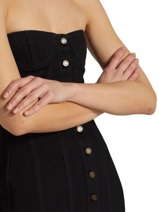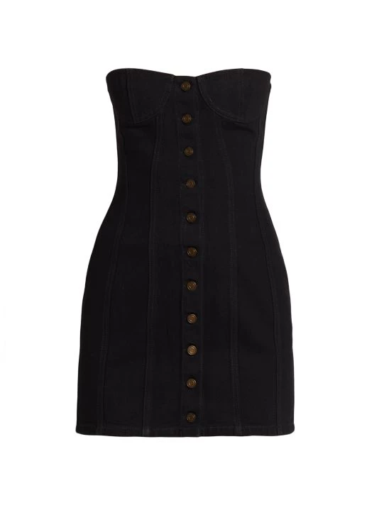 Crafted of structured denim, this strapless minidress offers a contrast button front.