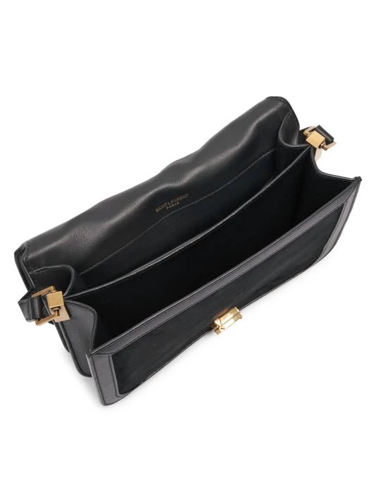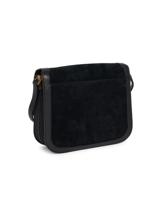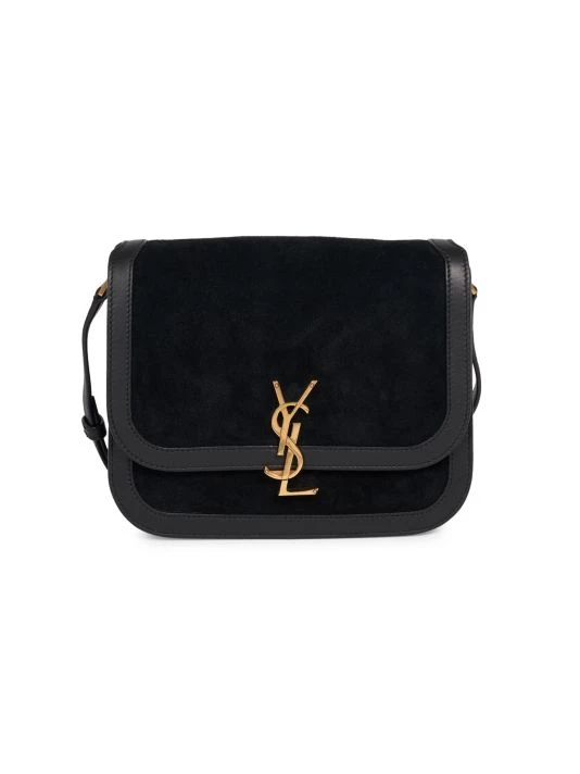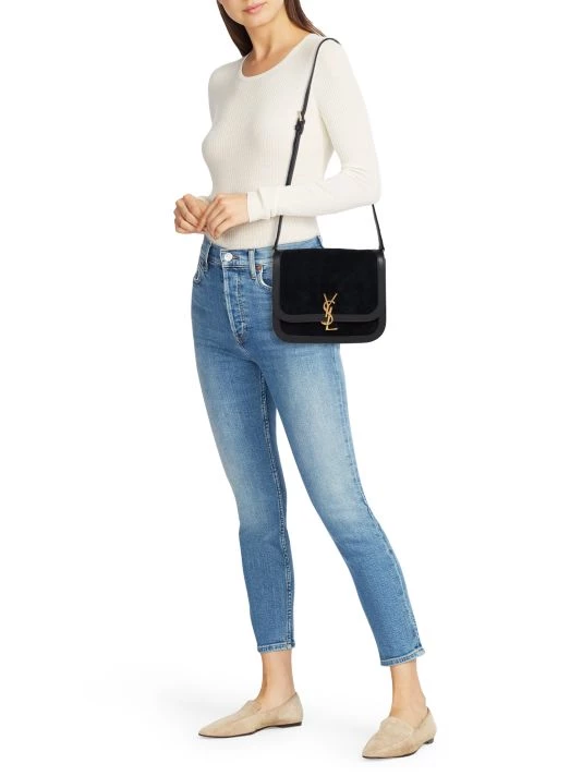 This supple suede shoulder bag has smooth leather trims and a signature goldtone metal logo hardware that finishes with timeless appeal.