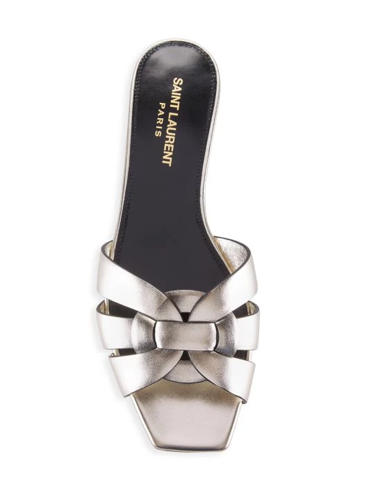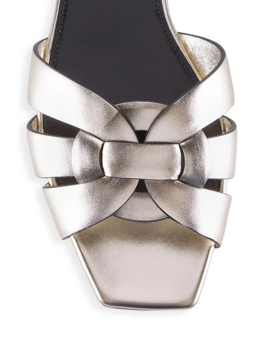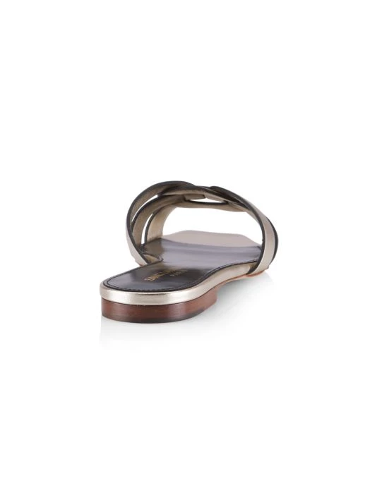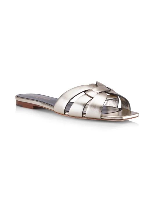 Enhanced with a blunted square toe, Saint Laurent’s Tribute sandals feature interlocking straps creating a perfectly circular medallion. This Italian-made pair is crafted of eye-catching metallic leather.