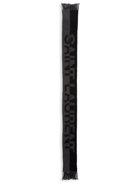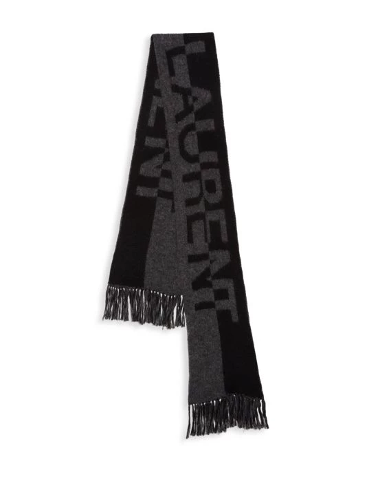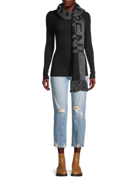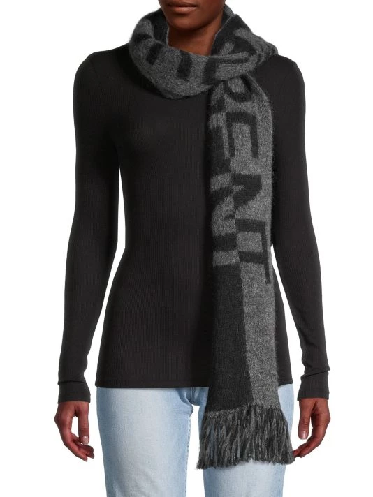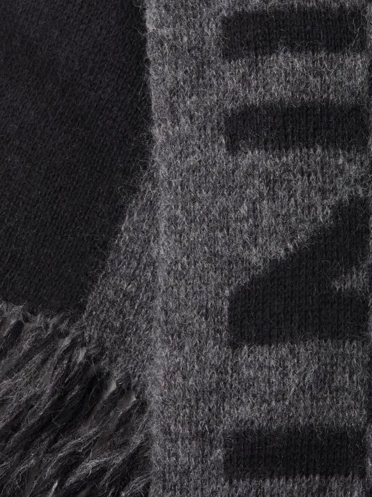 Alpaca-mohair blend scarf boats a split two-tone design with bold logo type, finished with fringe trim.