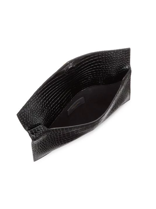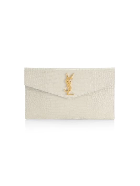 Crocodile embossed leather creates this envelope pouch highlighted with signature YSL logo hardware.